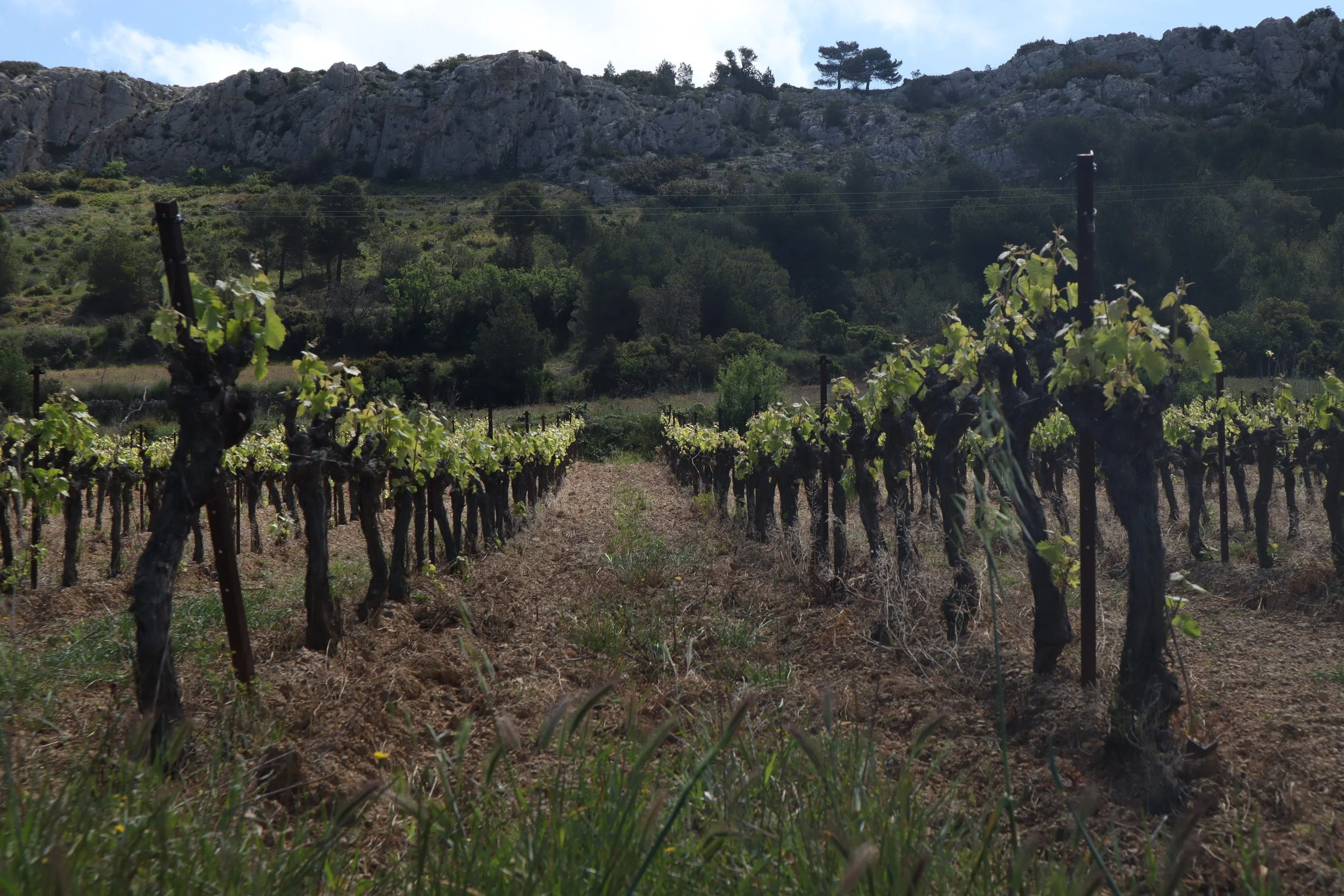After leaving the village I found myself walking along farm tracks which ran between deserted farms set amid rolling vines, the only things tough enough to do well in the poor soil. The vines are all dazzling spring green leaves contrasting against black gnarled stems. I wondered briefly if all the farmers had gone to Narbonne and what side they’d be on.